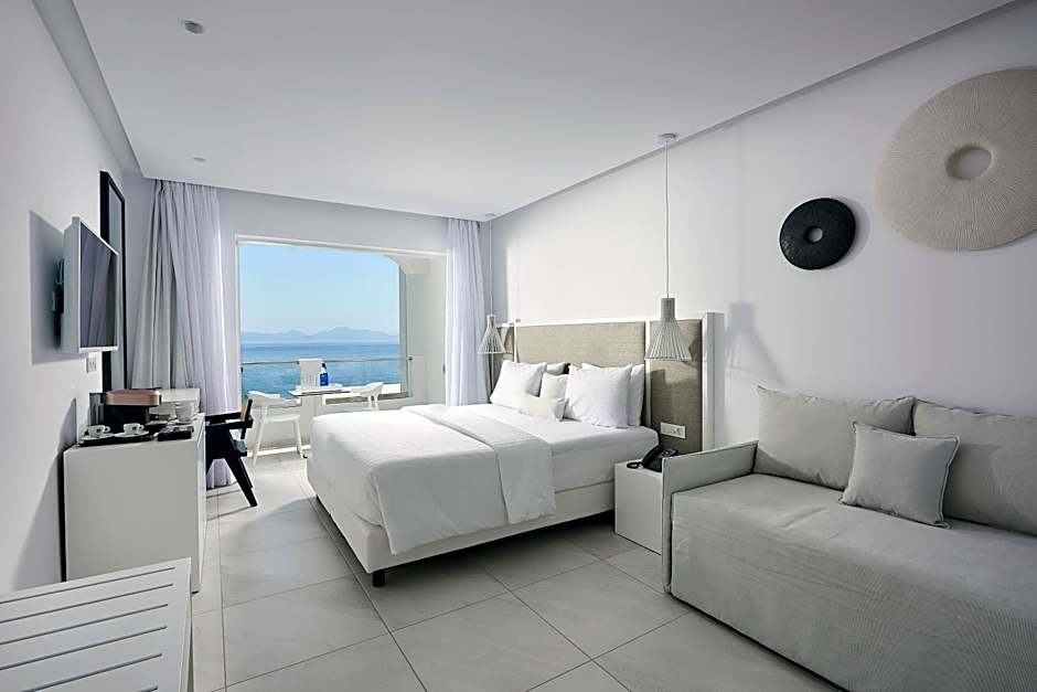 This suite overlooks the Aegean Sea and the pool from its balcony or terrace. It includes: